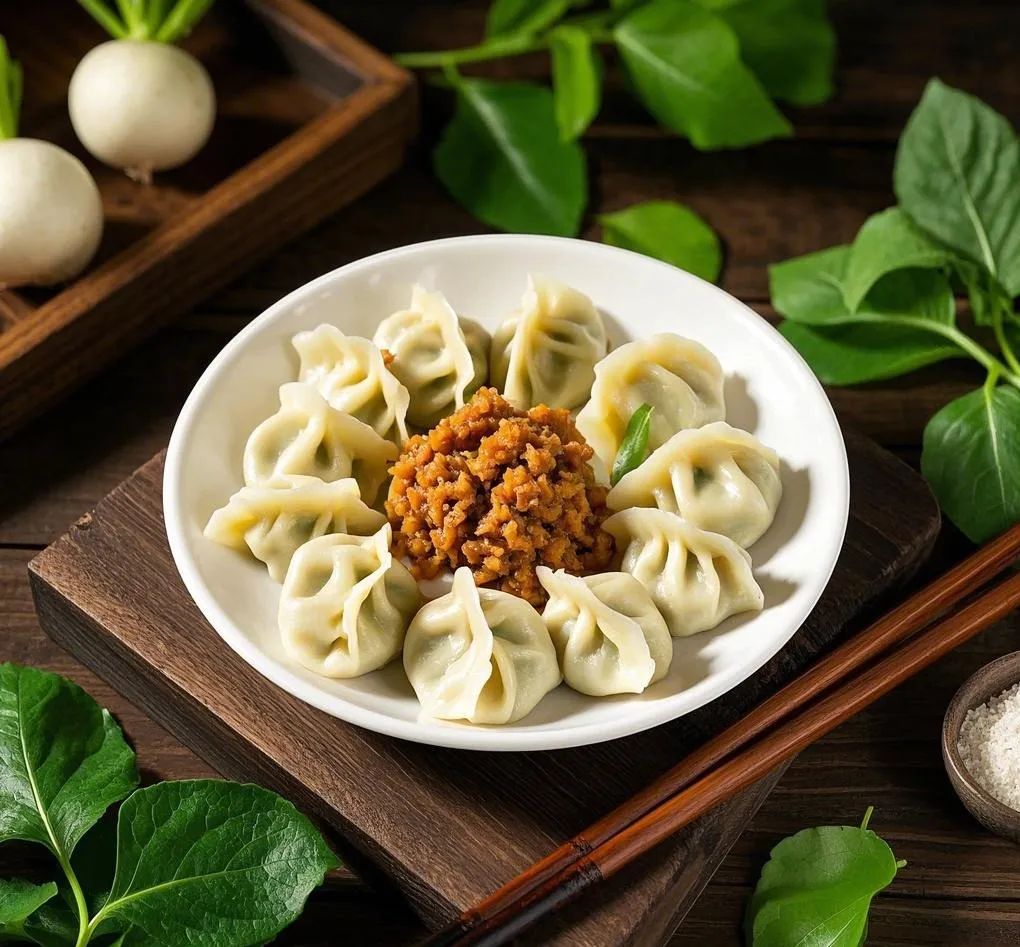 所需材料(饺子皮部分略,可自行购买或自制):猪肉馅300克、白萝卜1/2根,擦丝后剁碎、生姜末1汤匙、葱花适量、盐1茶匙、生抽1汤匙、老抽半汤匙(上色用)、香油1茶匙、食用油适量