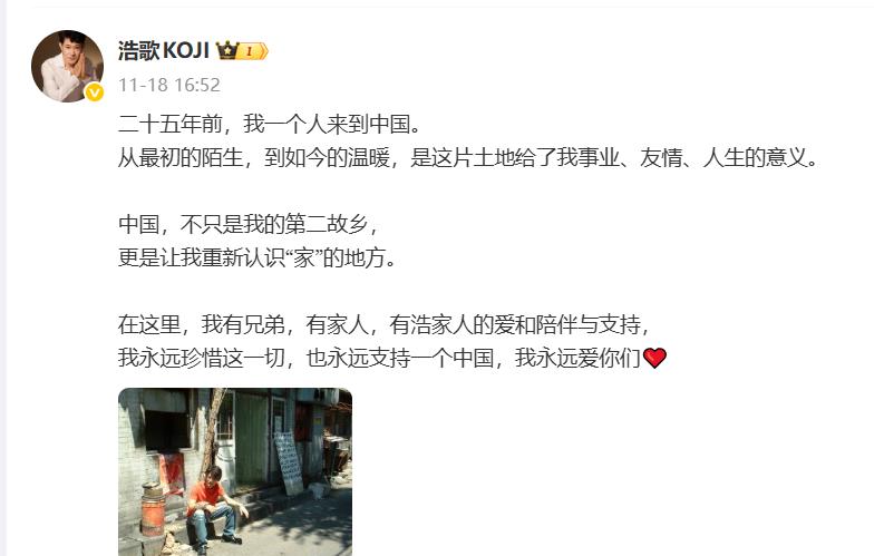 矢野浩二此次硬刚,并非投机取巧,他对中国是有真实的了解11月18日,矢野浩二在个人微博上发表了一段意味深长的话,说:“中国,不只是我的第二故乡,更是让我重新认识“家”的地方,我永远珍惜这一切,也永远支持一个中国,我永远爱你们。”