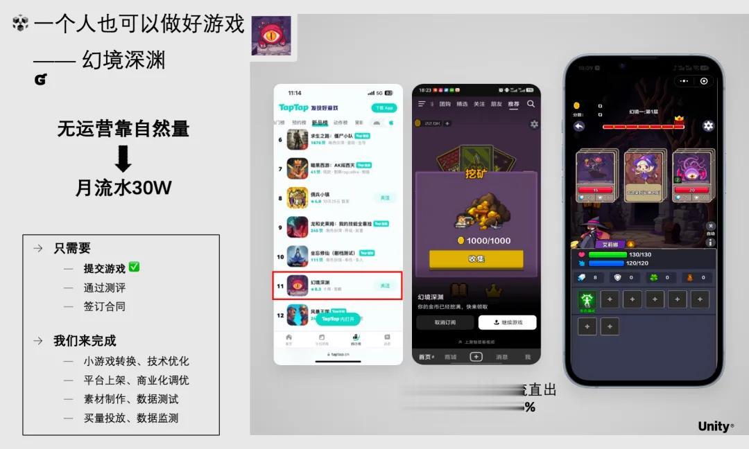 因此他表示,Unity中国的发行业务明确以小游戏平台为主,不涉足原生Steam或PC游戏。官方数据显示,其发行业务今年以来的总收入已达数千万元,月均增长30%-40%,发行产品已超过100款。
