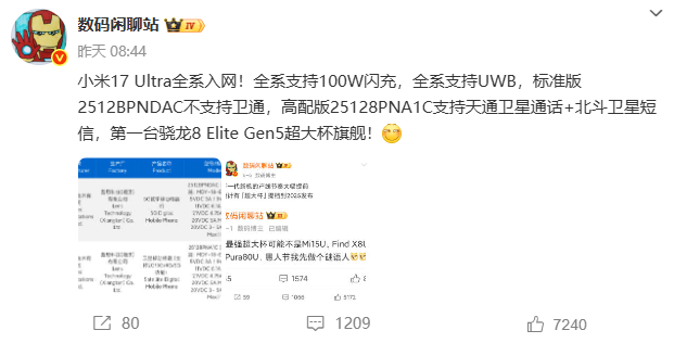 近日,博主@数码闲聊站 发文透露:“小米17Ultra全系入网!全系支持100W闪充,全系支持UWB,标准版2512BPNDAC不支持卫通,高配版25128PNA1C支持天通卫星通话+北斗卫星短信,第一台骁龙8 Elite Gen5超大杯旗舰”。没想到,今年国产的第一台超大杯还是小米给的。