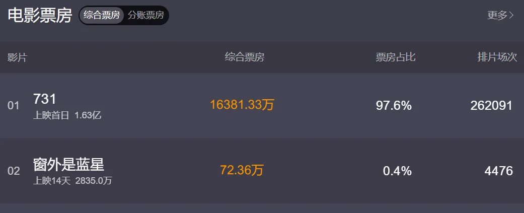 电影上映前,便已在中国引起了极高的关注。“猫眼电影” 数据显示,“想看” 人数已达 450.4 万,预售总票房 1.08 亿元,首日排片达 21.7 万场。影片上映后,更是在国内引发了强烈的共鸣。截至发稿时,影片票房已突破1.63亿。观众们在观影过程中,或悲愤交加,或潸然泪下,走出影院后,内心久久不能平静。大家纷纷在社交媒体上分享自己的观影感受,对 731 部队的暴行表示强烈谴责,同时也更加深刻地认识到今天的和平来之不易。