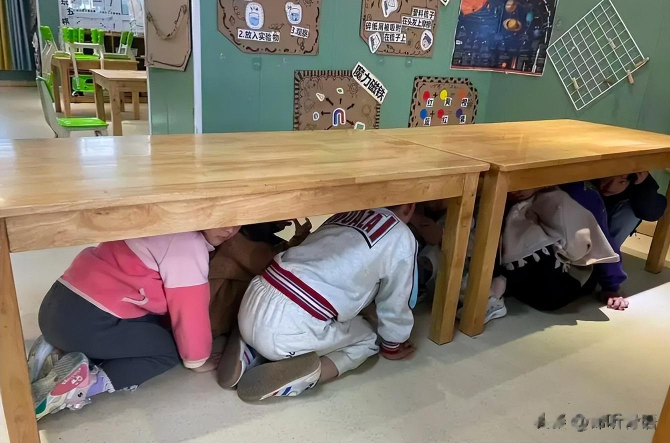 趴在结实的桌子底下时,记得把膝盖收起来,双手护住头部和颈部,这样能最大程度减少受伤面积。