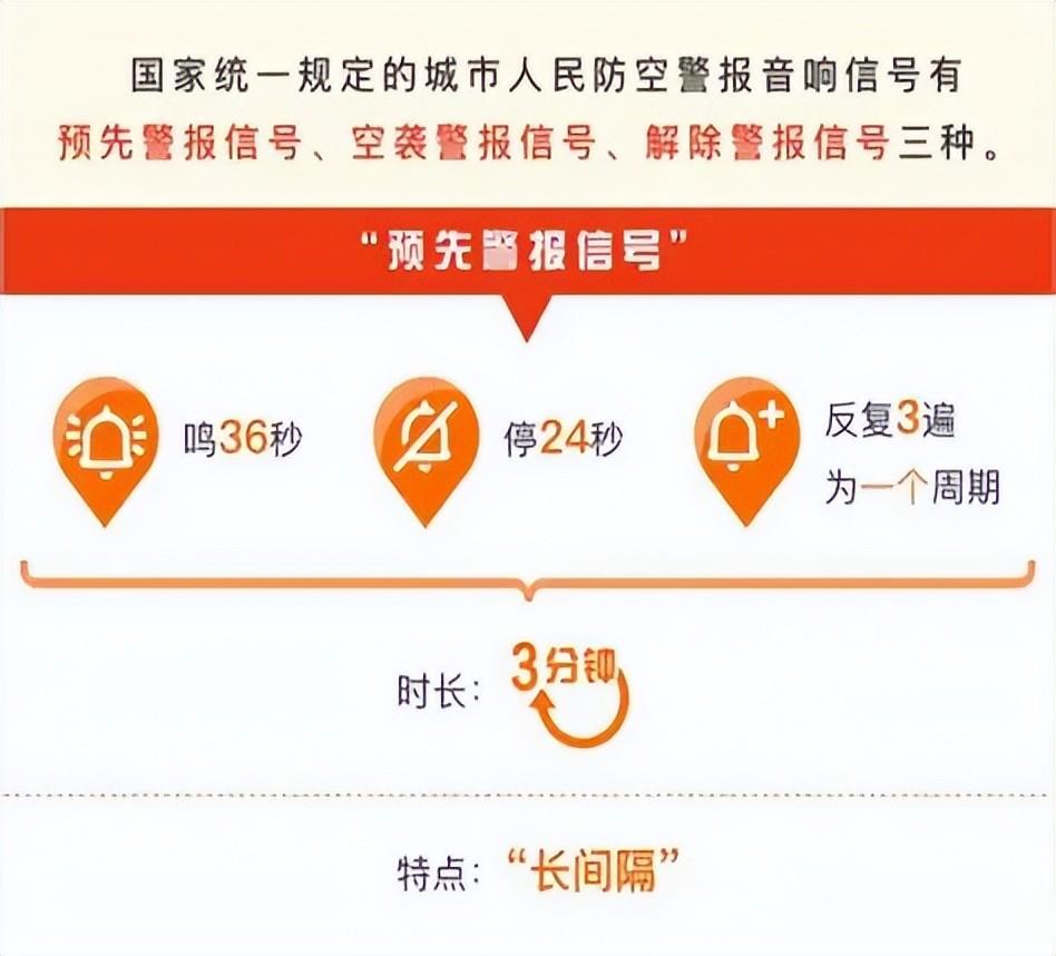 第一种叫预先警报,节奏是“鸣36秒,停24秒”,这样反复3遍,刚好3分钟。
