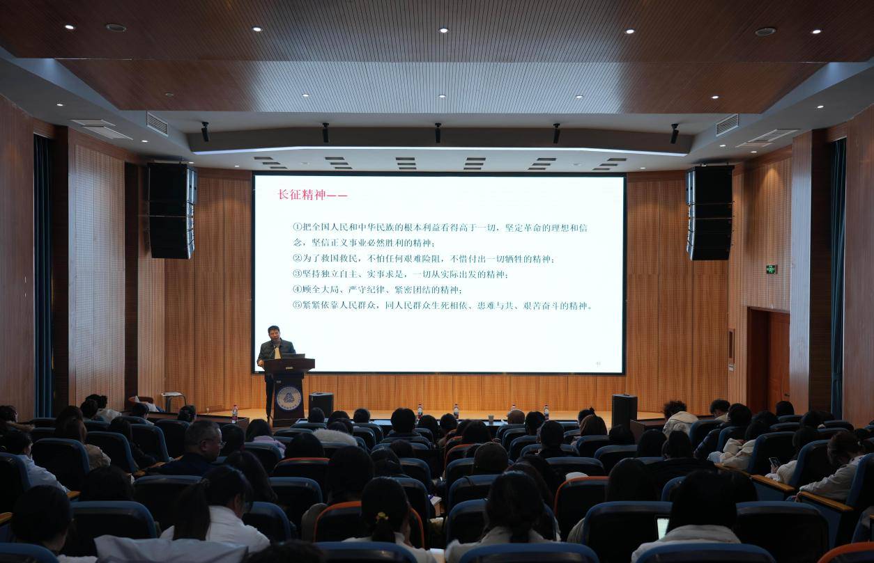 整场报告史料翔实、论述深刻、语言生动,兼具政治高度、理论深度与实践温度。与会师生全神贯注,沉浸于这场深刻的思想启迪与精神洗礼之中。报告不仅清晰勾勒了中国共产党人的精神谱系的历史脉络,更聚焦于“青春实践”,为新时代青年传承与弘扬中国共产党人的伟大精神指明了行动方向,系统阐述了五点践行路径:一是筑牢根基,把稳思想之舵,强调必须坚持党的领导,深化理论武装,从中国共产党人的精神谱系中汲取坚定理想信念的力量;二是洞察时势,明晰前行之路,教导青年要深刻把握世界百年变局与民族复兴全局,在复杂环境中保持清醒、砥砺胆识;三是锤炼内核,端正价值之标,寄语青年树立符合新时代要求的正确“三观”,领悟精神实质,做到“得‘意’忘‘形’”、涵养品格;四是脚踏实地,砥砺奋斗之姿,鼓励学生将个人发展融入国家需要,立足当下学业科研,坚持求真务实、知行合一;五是善作善成,扛起使命之担,倡导在苦干中锤炼意志,在巧干中创新方法,真正将精神血脉赓续于实现民族复兴的实际行动中。五点路径环环相扣,从思想到行动,从内化到外化,为青年学子如何将宏大的中国共产党人的精神谱系转化为具体的成长指南提供了既富哲理性又具操作性的深刻指引,引发了现场师生的深度思考与强烈共鸣。