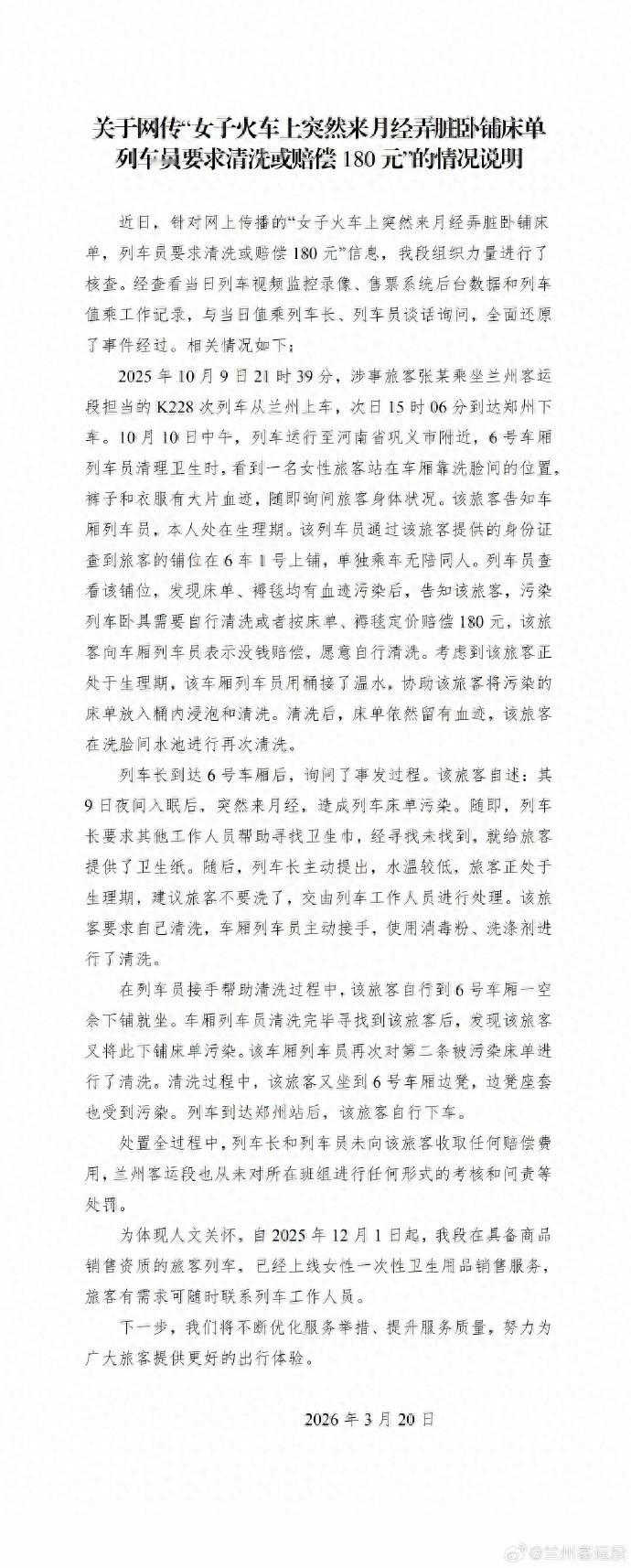 近日,针对网络上流传的一则“女子因月经弄脏卧铺床单被要求赔偿180元”的消息,兰州客运段于3月20日发布了情况说明。声明中明确表示,客运段并未向该女子收取任何赔偿费用。事件的真实情况与网络传言存在出入。兰州客运段表示,对于乘客在旅途中遇到的特殊情况,将一贯秉持理解与人文关怀的原则,努力提供更加贴心的服务。此外,客运段已针对卧铺环境和清洁管理进行了全面改进,提升乘客的舒适度和满意度。此次澄清不仅还原了事件真相,也展现了兰州客运段积极回应社会关切、不断优化服务质量的决心。乘客在旅途中如遇类似问题,也可及时与工作人员沟通,共同维护良好的乘车环境。