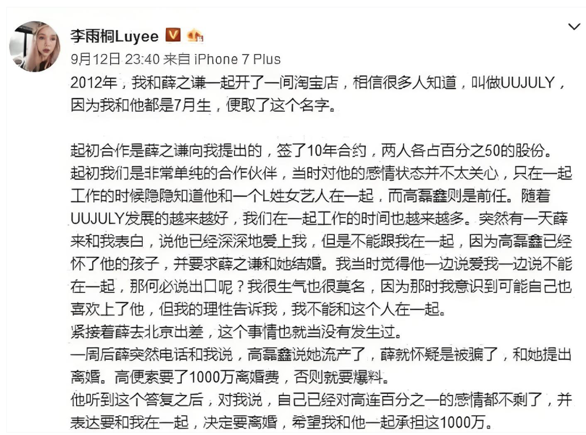 紧接着更猛的料来了,李雨桐说薛之谦在和高磊鑫婚内期间,就对她展开了猛烈的追求,离婚后更是以被高磊鑫骗了感情和钱为由,让她共同承担那1000万的分手费。