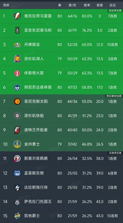 北京时间4月9日,NBA部分球队已经进行了第80轮的比赛,我们看看战况和西部的最新排名!主要的信息是:雷霆128-110战胜快船,马刺112-101战胜开拓者,掘金136-119复仇灰熊,森林狼120-132不敌魔术,太阳112-107险胜独行侠!