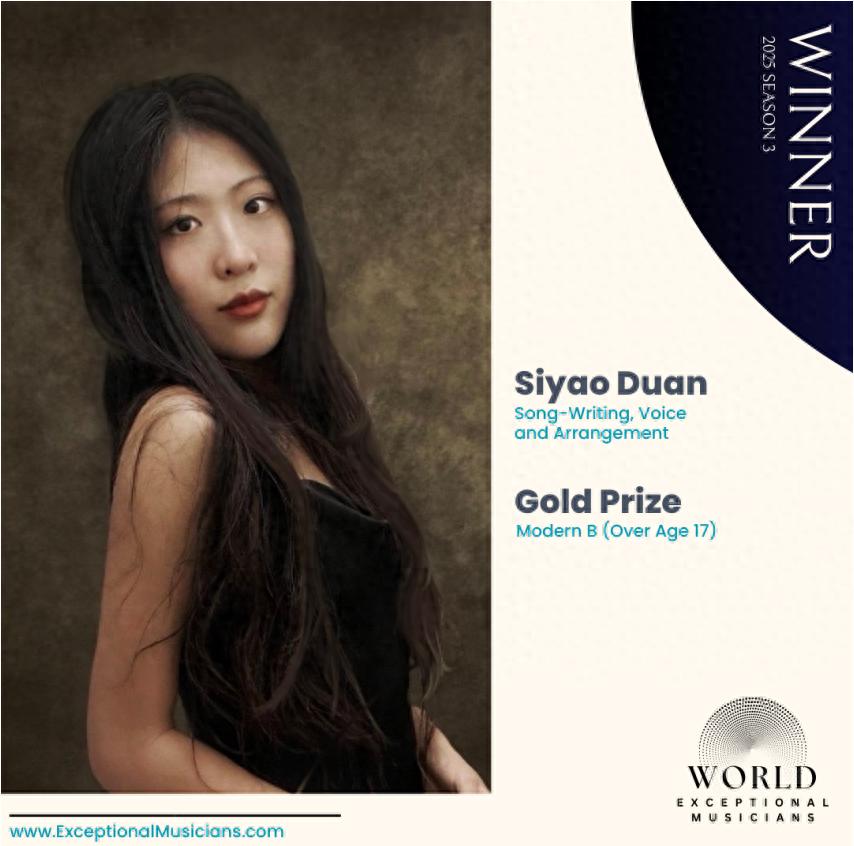 (狐崖网李璐编辑)来自北京的歌手不蓝(原名段思瑶),用一首自作曲、首次独立编曲并亲自演唱、参与作词的《假装遗憾》,于2025年8月12日在 World Exceptional Musicians Competition 2025(2025世界杰出音乐人大赛) 夺得 Gold Prize(金奖)。