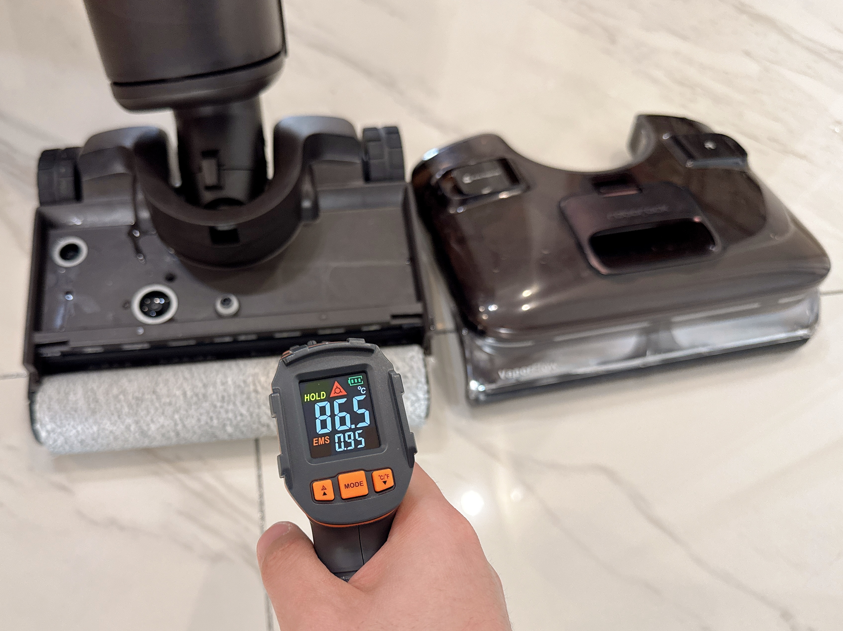 经过实测,清洁过程机器的滚刷表面温度为86.5℃,考虑到打开滚刷盖的过程中有热量散失误差,所以官方宣称的90℃高温绝非噱头。
