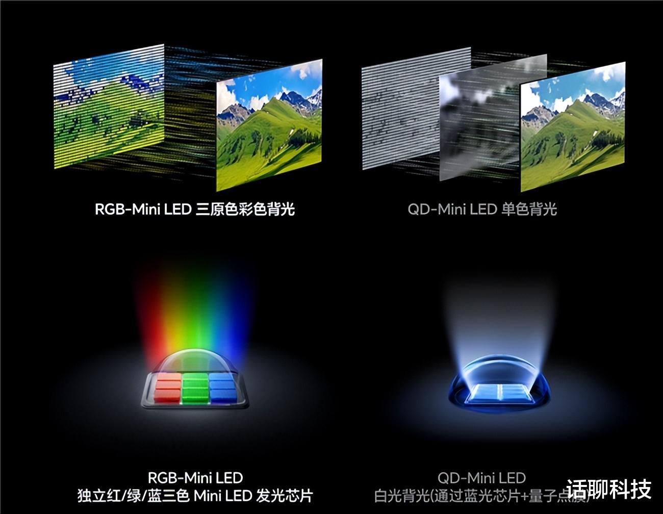 并且RGB-Mini LED的背光光源是R、G、B三色发光芯片阵列,每一路都是可以单独控制色彩亮度,这种单独色彩调节,就释放了RGB三色的混光显示自由度,也就是体现在了色彩上。这样一来,在屏幕结构上,其与量子点Mini LED显示技术相比,在控光自由度上,不仅是亮度控制、还能实现色彩控制,这就是光色同控的由来。