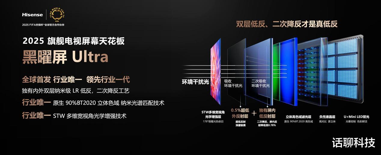 从目前了解到的海信电视产品搭载的屏幕分类来说,都是采用了超低反光设计,目前最顶级的是黑曜屏Ultra,行业内唯一搭载内外双层纳米级低反膜,可以用实现1.28%超低反光率。