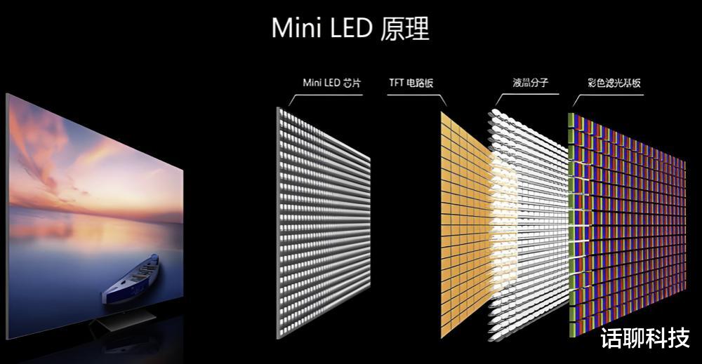 而RGB-Mini LED本质上依旧是LCD无机材料显示技术的发展,但不同于传统LCD的大尺寸背光模组,其结构结构上把直径100-300微米的分区可控亮度的MiniLED灯珠阵列,代替传统的LCD的背光光源,从而获得媲美OLED的黑色真黑和超高对比度优势,并弥补了OLED屏幕有机发光材料寿命短、容易烧屏、亮度不够高的劣势。