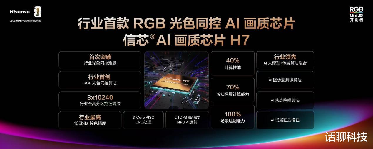 与RGB-Mini LED发光芯片同样重要的,还有信芯AI画质芯片H7,因为如果没有信芯AI画质芯片H7的光色同控,而仅仅采用传统的控光方案,那么就不能真正发挥RGB-Mini LED的技术优势。