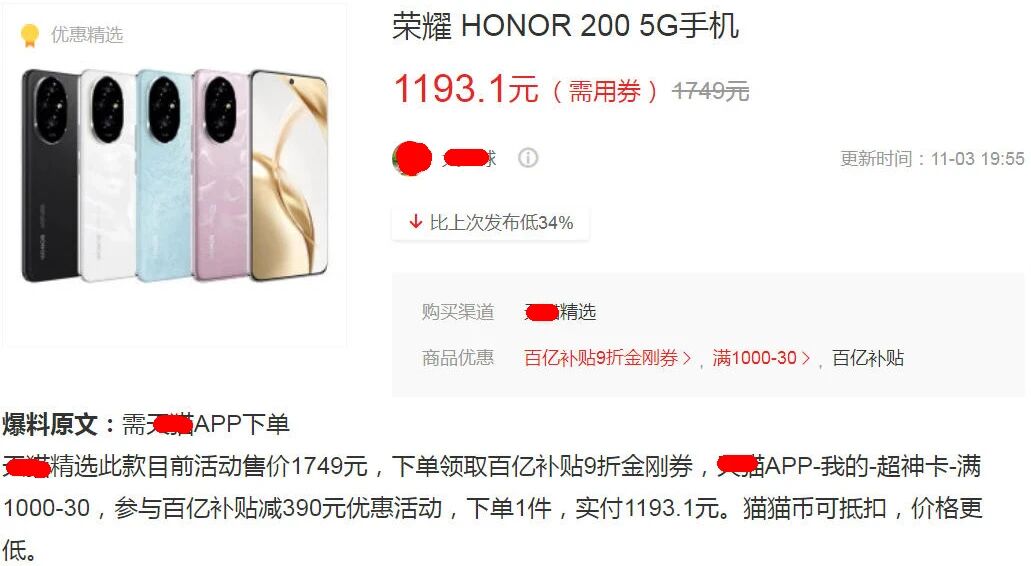 根据张大妈爆料, 某猫活动价1749元的荣耀200,通过多重满减后,最低实付1193.1元。如果用猫币抵扣,还可以做到更低价格。但最重要的是,爆料人漏掉了关键信息,那就是这个价格对应的是12G+512G的大容量版,不是常见的12G+256G乞丐版。