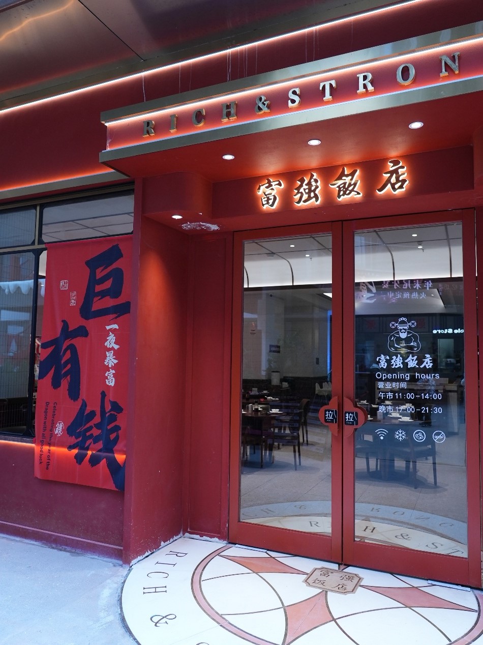 说起浙江味道,总绕不开一碗鱼饼的鲜、一盘炒粉干的香。而杭州的温州菜馆里藏着一份惊喜:富强饭店——红墙金字的中式门头下挂着一行英文“RICH & STRONG”,玻璃门推开时,左边是肌肉财神举筷捞金锅的漫画墙,右边却摆着米白色桌椅,混搭得像个清醒的暴发户。开放式厨房上方悬着“繁荣富强”的灯牌,烟火气顺着锅铲声漫出来。