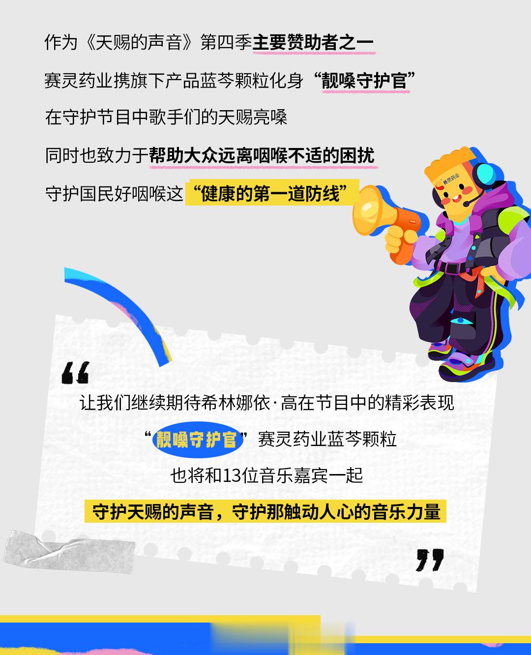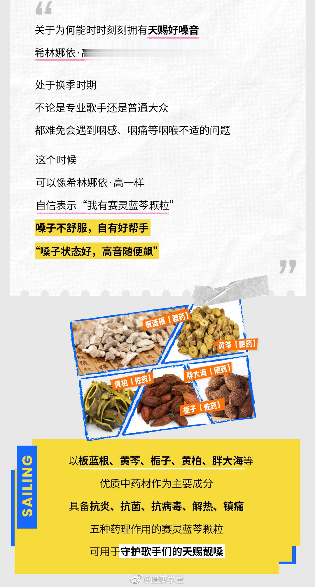 嗓子状态好,高音才能随便飙,她曾在节目中自信表示“我有赛灵蓝芩颗粒”。主要成分为板蓝根、黄芩、栀子、黄柏、胖大海,能够抗炎、抗菌、抗病毒、解热、镇痛的#赛灵蓝芩颗粒#不仅在节目中呵护歌手们的靓嗓 ,也致力于帮助大众远离咽喉不适。愿大家都能守护自己好健康的第一防线[抱抱]#谁是你心中的内娱清唱top1#
