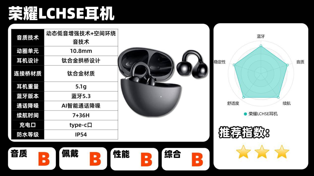 荣耀LCHSE耳机的佩戴体验相当舒适,采用了钛合金拱桥结构,耳机能自然贴合耳廓线条。单只耳机仅5.1克,轻到几乎感觉不到重量,长时间使用也不压耳。无论是在通勤还是跑步场景下,佩戴都稳固不易掉落。
