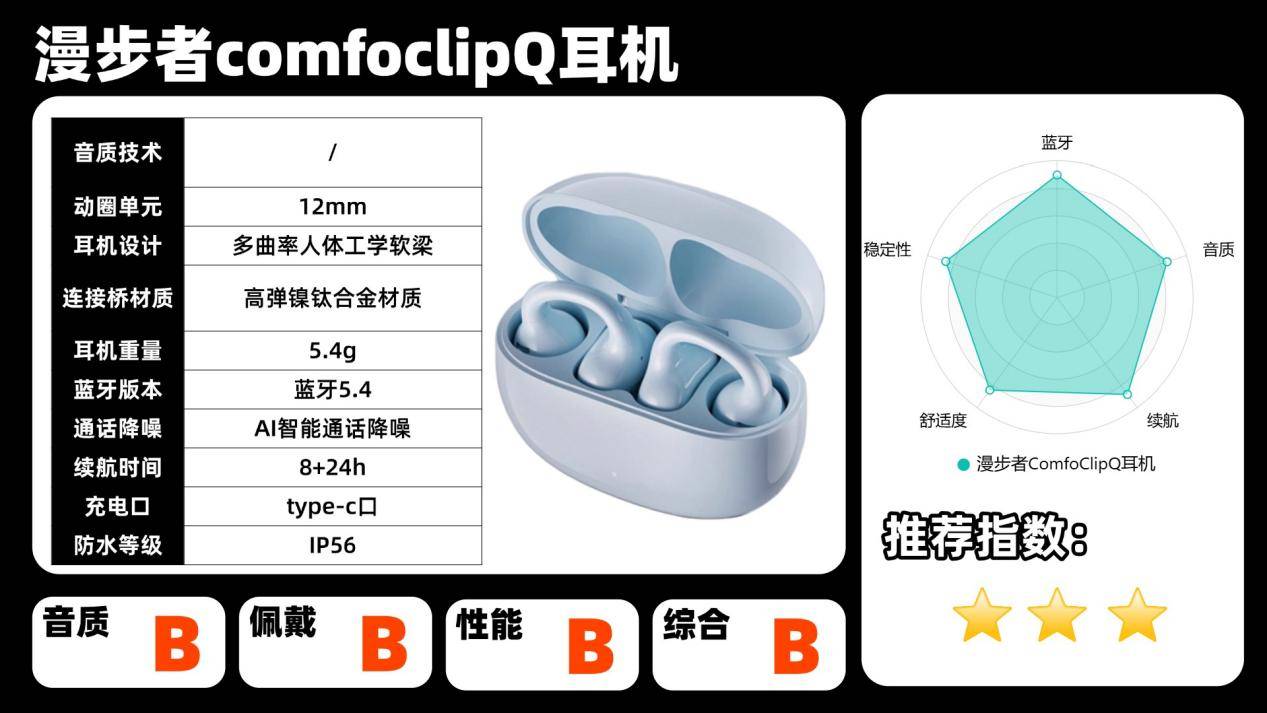 漫步者ComfoClip Q耳机的佩戴体验相当不错,采用了多曲率软梁人体工学设计,耳机能自然贴合耳廓曲线。单只耳机的重量仅5.4克,佩戴轻盈不压耳,运动时也不容易掉落。唯一的小缺点是夹持间距稍紧,耳廓较厚的用户长时间佩戴可能会有一点夹耳感。