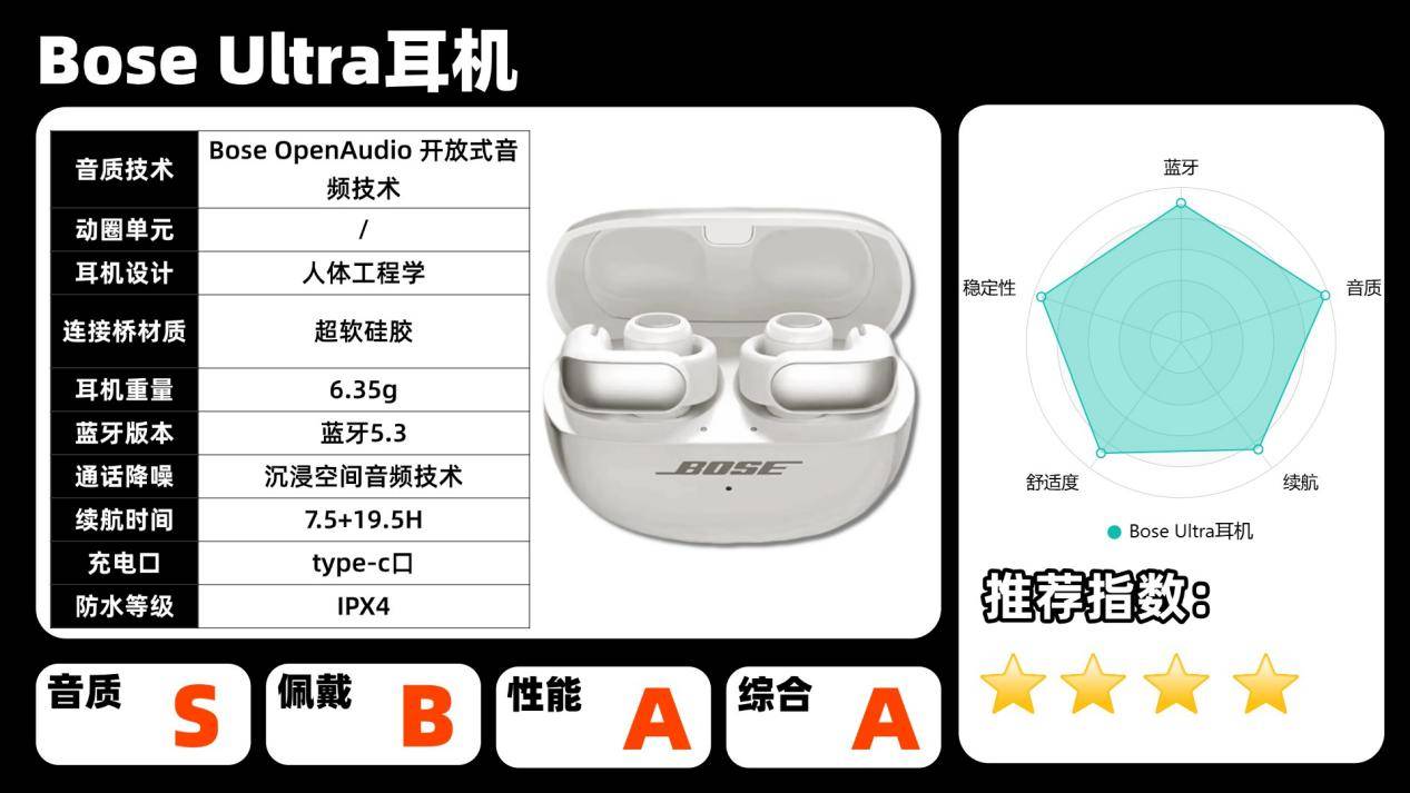 音质表现方面,Bose Ultra搭载了自家的OpenAudio开放式音频技术,三频的表现均衡细腻。低频扎实有弹性,中频人声自然饱满,高频通透不刺耳,还支持沉浸式音频模式,看电影或打游戏时环绕感十足。整体听感属于旗舰水准。