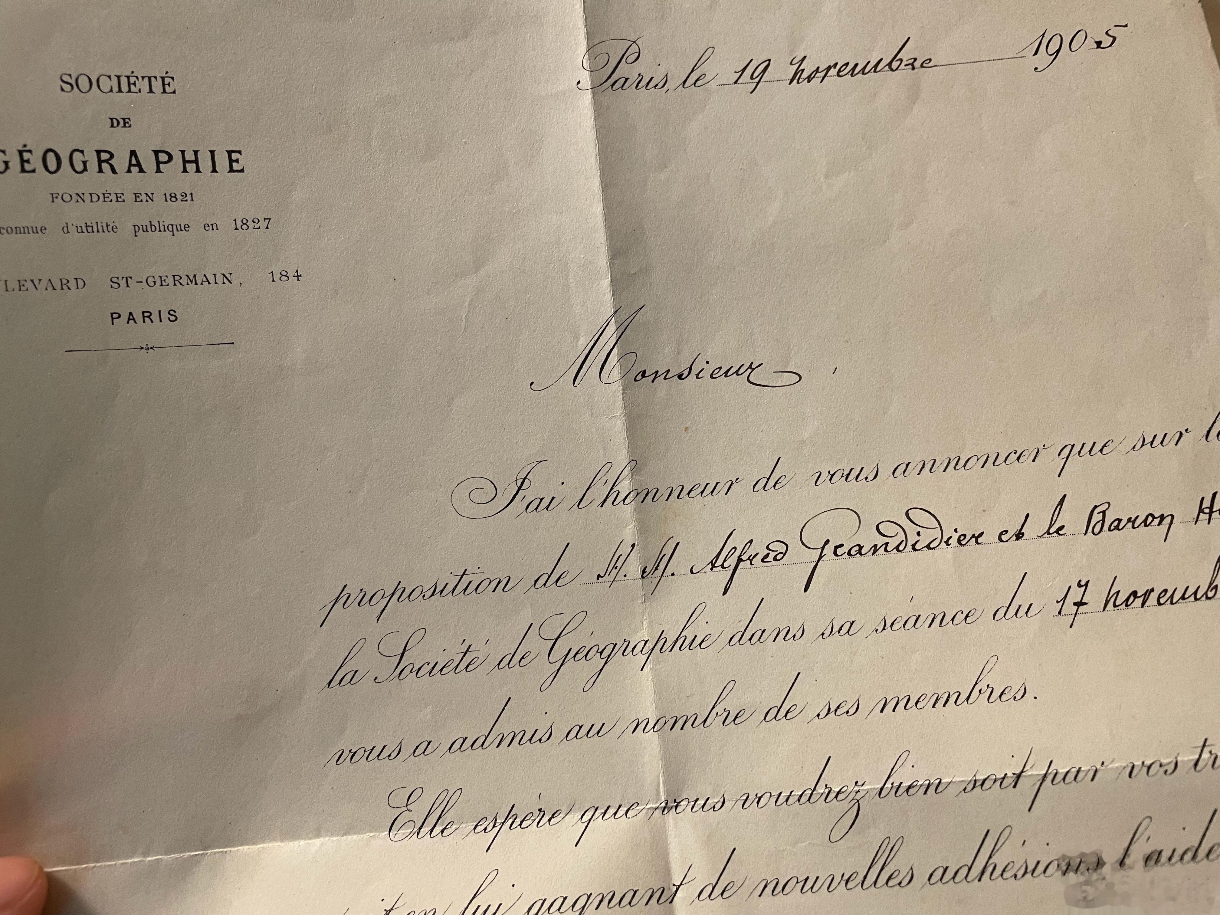 军医路易.瓦杨是伯希和的好友,也是他在亚洲之行中的得力助手。最近新找到的这封信件是法国地理学会批准瓦杨加入时的通知。从其内容可知,1905年底瓦杨在学会重要成员探险家阿尔弗雷德.格兰迪底尔和于洛男爵的推荐下经学会讨论获准加入,通知的最后附有海军中将于曼的签名。法国地理学会是世界上最早的的地理学会之一,在当时的历史背景下地理学是一门显学,受到西方列强的重视,世家子弟往往以斥资进行探险并发表游记为志向。瓦杨加入地理学会可能源于他先前在越南时的经历,但值得注意的是两位举荐人都与他的父亲相熟。其父莱昂.瓦阳是当时著名的动物学家,与不少探险家都有合作关系。瓦杨继承了父亲的志向,对动物研究也有很大的兴趣。