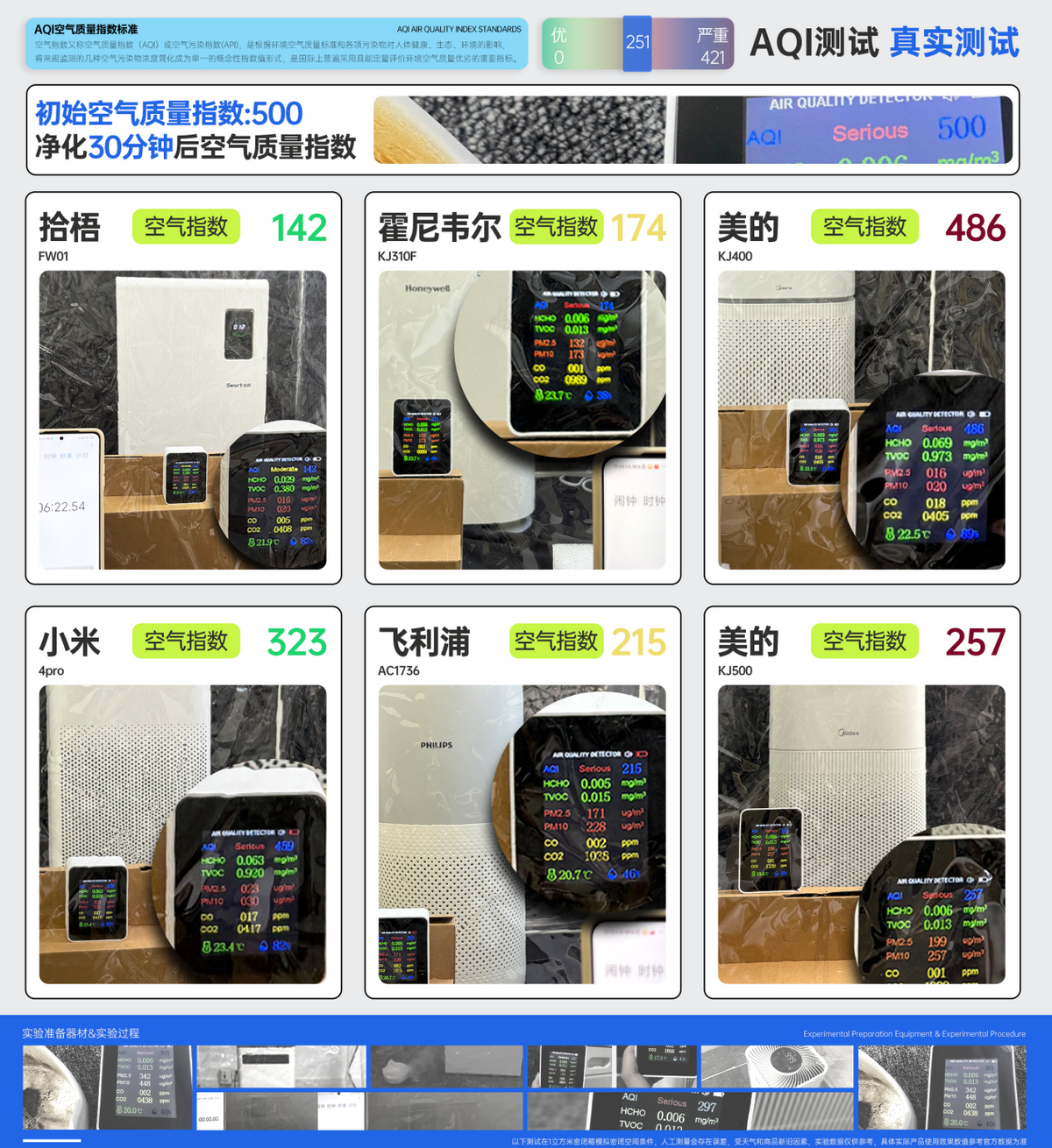 测试环境初始设定AQI为500,模拟极端污染场景。将测试的六款空气净化器分别独立运行30分钟,记录净化后的AQI数值。测试期间保持空间密闭,确保空气流动受控,数据真实、具可比性。