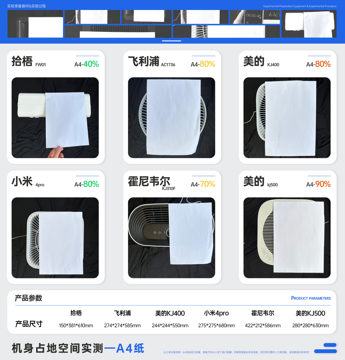 空气净化器的实际占地面积直接影响其在室内空间中的摆放便利性,尤其是对于空间有限的家庭、办公室或商业场所。体积越小越利于灵活布置,特别是壁挂式结构更具节省地面空间优势。因此,通过标准A4纸对比各机型占地面积,可以直观反映其机身紧凑程度和实用性。