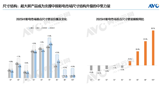 一是量缩价升的结构性分化。奥维云网(AVC)推总数据显示,2025年上半年彩电市场销量达1375万台,同比微增1.8%,但销售额同比增长7.5%,销额攀升至561亿元。细分尺寸中,75英寸及以上产品销量占比为40%,85英寸产品销量份额同比增长2.9个百分点,98英寸、100英寸产品销量同比分别增长57.4%、83.1%,印证了大屏化驱动价值升级的核心逻辑,市场结构逐步向大尺寸、高价值加速倾斜。