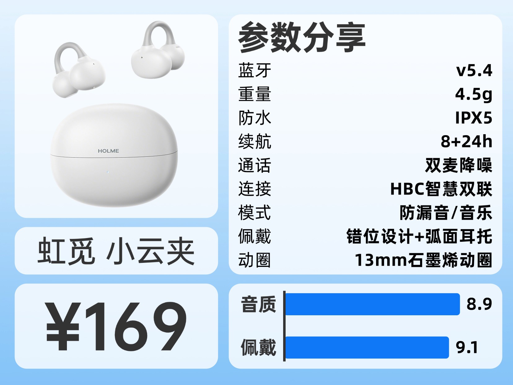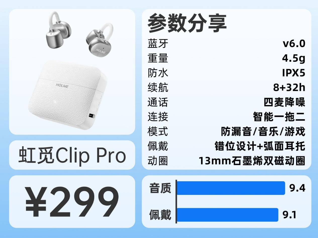 这款虹觅Clip Pro单耳只有4.5g,佩戴起来基本没什么存在感,也不会有夹耳的感觉,而且前高后低的2.5mm错位设计搭配电池仓12度弧面耳托,能更好的贴合耳背,进一步提升贴合度与舒适度。动圈选用13mm双磁喇叭,靠两款高精度叠加磁铁配合强磁场,进一步提升音质与音量;还采用气旋式引擎腔体技术,打造圆柱形铝合金金属腔体,承载更多气流量以提高声音推力,带来更澎湃的重低音。配合上石墨烯科技振膜的高形变能力,和虹觅声学实验室的专业调音,能确保整体音质稳定不失真,细节更饱满,可以说是五百价位音质最好的耳夹式耳机!而且这款虹觅Clip Pro还支持自研的防漏音模式,开启后能发出反相声波,大幅降低泄露的声音,在图书馆、宿舍等一些安静环境下使用也不怕,整体配置也在线。