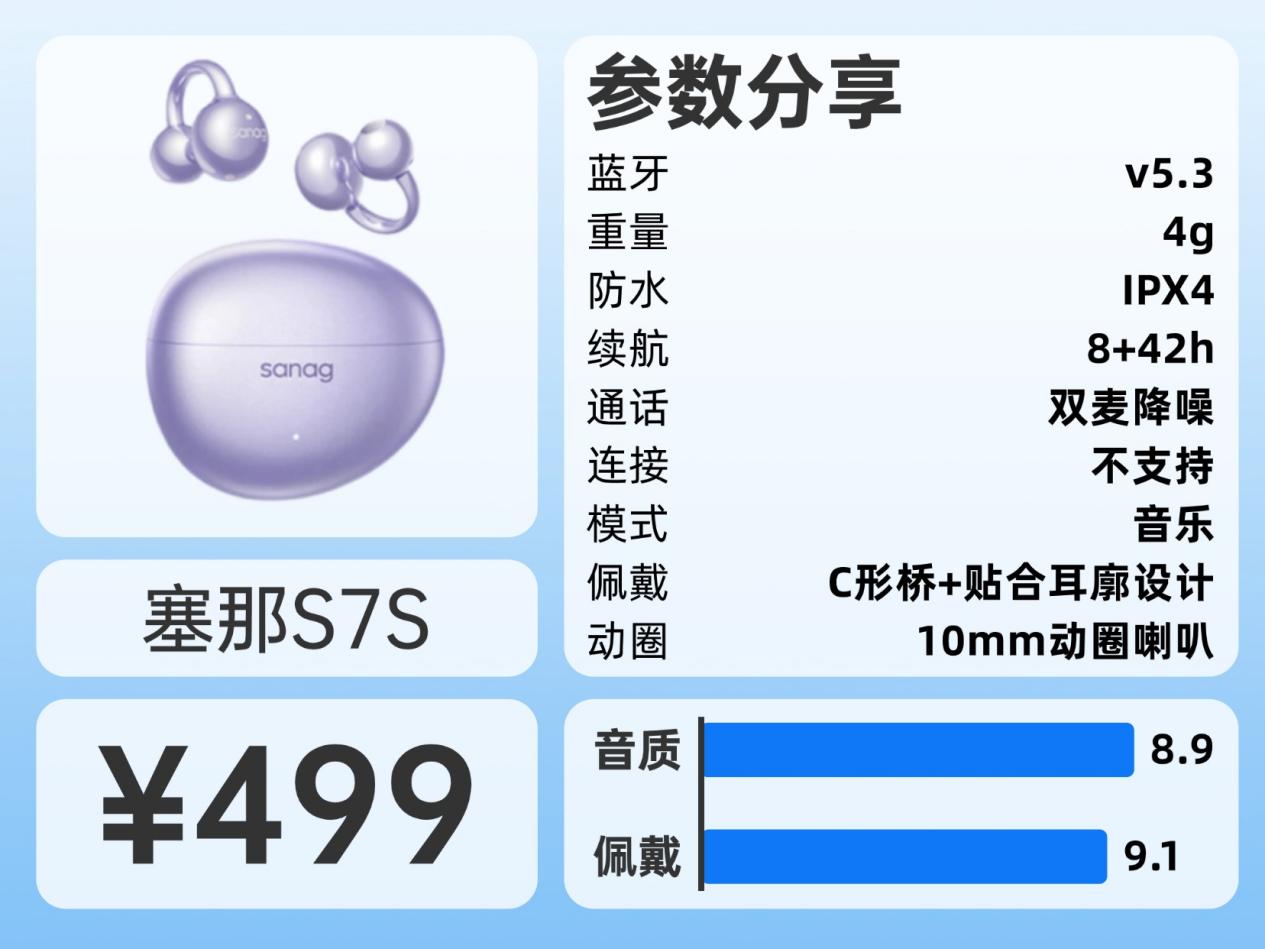 佩戴上,塞那 S7S 的舒适感让人惊喜,单耳超轻的重量几乎达到无感佩戴的程度,长时间使用耳朵也没有压迫感。记忆柔丝材质的耳夹支臂柔韧可调节,能自适应贴合不同耳型,搭配人体工学设计,跑步等运动时稳固不掉,日常通勤或运动都很适配。但是听感上,低频虽有增强但不够醇厚,中高频解析力尚可,细节表现却不突出。整体音质较为一般。性能配置很全面,续航表现亮眼,单次使用和总续航都很够用,一周充一次电基本能满足需求。IPX4级防水能应对汗水和小雨,还有防丢定位等实用功能,整体实用性和体验感都还行。