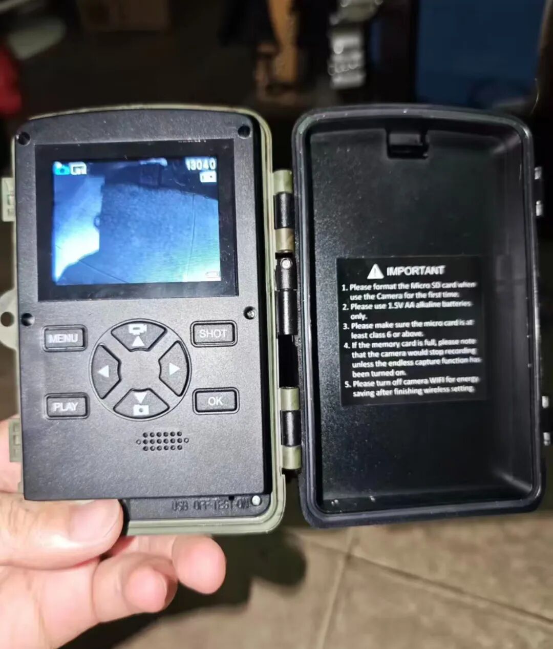 它内部还有一个类似HiFi播放器的带屏设备,上面有八个功能按键,右侧是英文提示,写着首次使用相机需格式化TF卡,并确保内存卡速度在6类及以上,需使用1.5V AA电池等信息。
