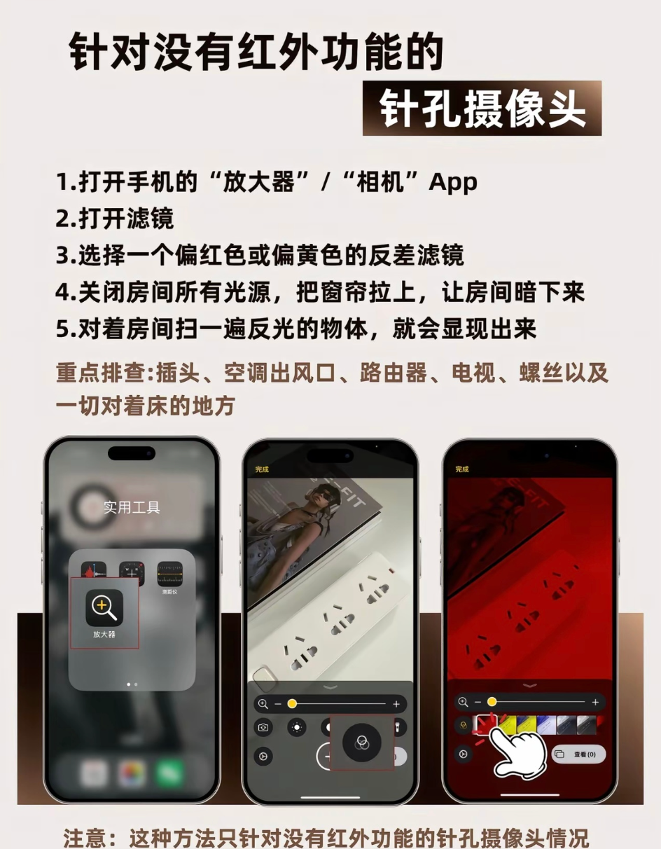 对着房间扫一遍反光的物体,就会显现出来重点排查:插头、空调出风口、路由器、电视、螺丝以及一些正对着床的地方。