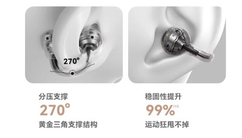 先看看耳机的佩戴。它用了创新的开放式耳夹设计,单只 5.9 克,重量控制得不错。独特的耳夹结构能贴合耳部轮廓,牢牢固定住,不会掉。
