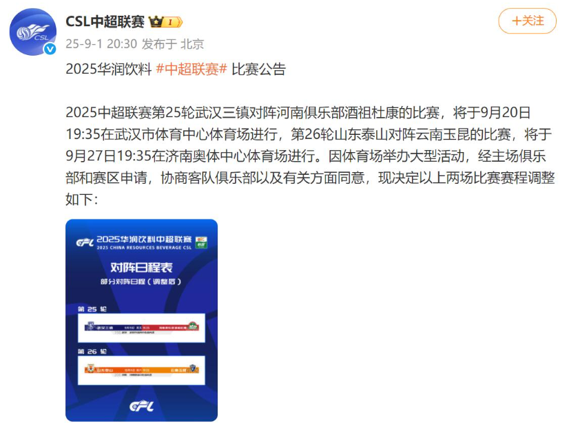 中超官方9月1日确认的赛程调整,为泰山队的夺冠征程注入强心剂。原定9月27日进行的与云南玉昆的比赛延至10月4日,这场被视为"复仇之战"的较量(首回合2-3失利),将移师国庆黄金周进行。据俱乐部票务系统数据显示,本场比赛门票预售已突破4万张,预计将创造本赛季中超上座率新高。