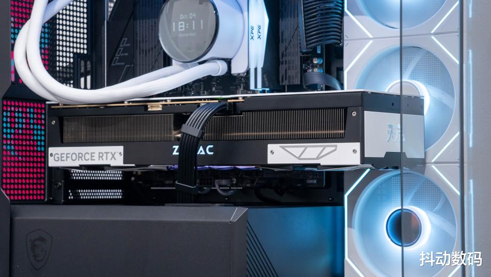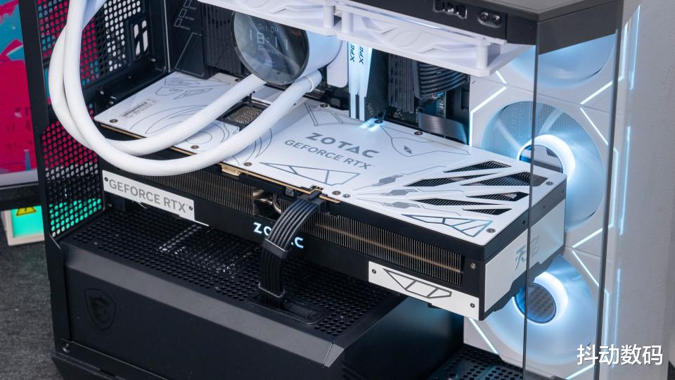 索泰的50系天启显卡在显卡正面、背面设计了较大的白色设计,但是在显卡侧面露出散热鳍片的部分则点缀了黑色,所以这样黑白配色的设计无论是白色或者黑色的装机方案它都是可以驾驭的。