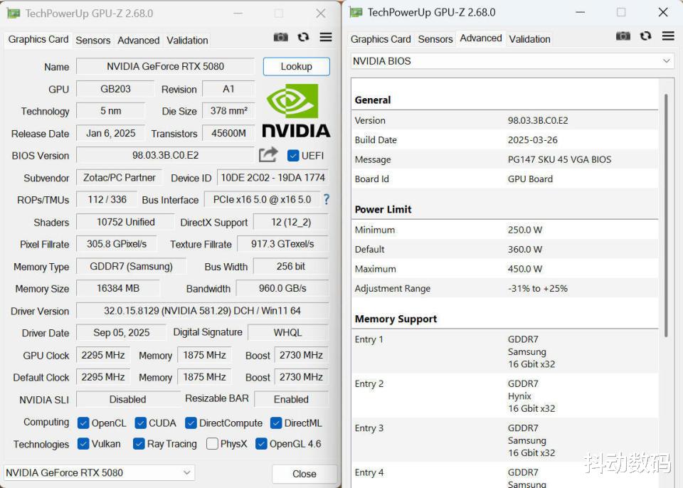 索泰 RTX5080 16GB 天启 OC显卡通过GPU-Z查看具体参数。