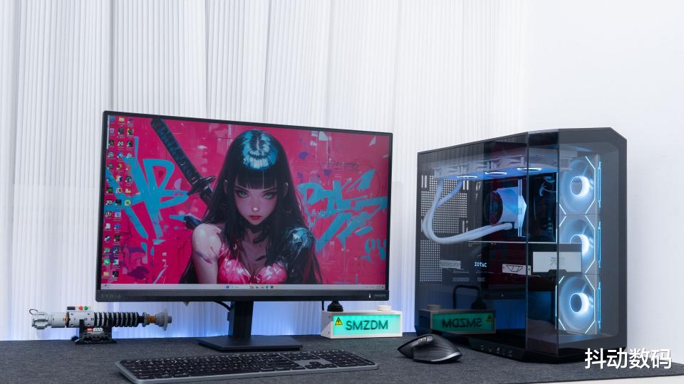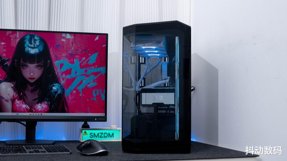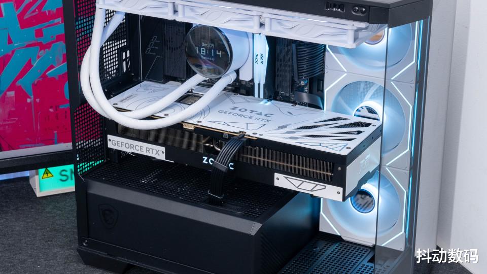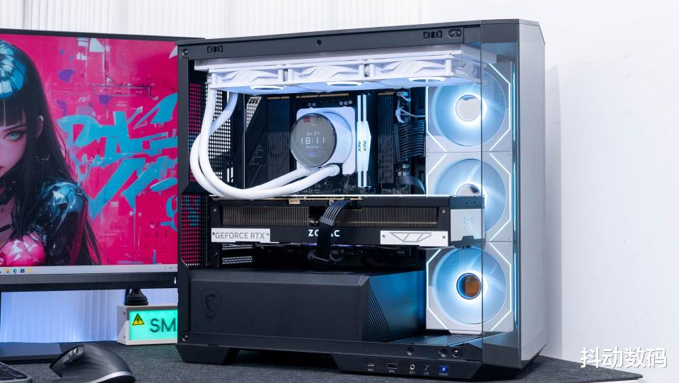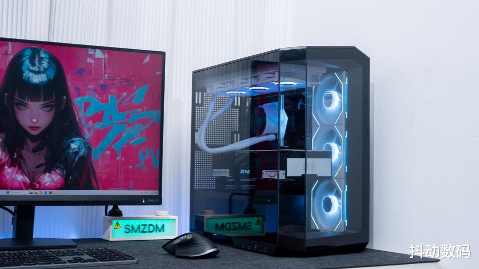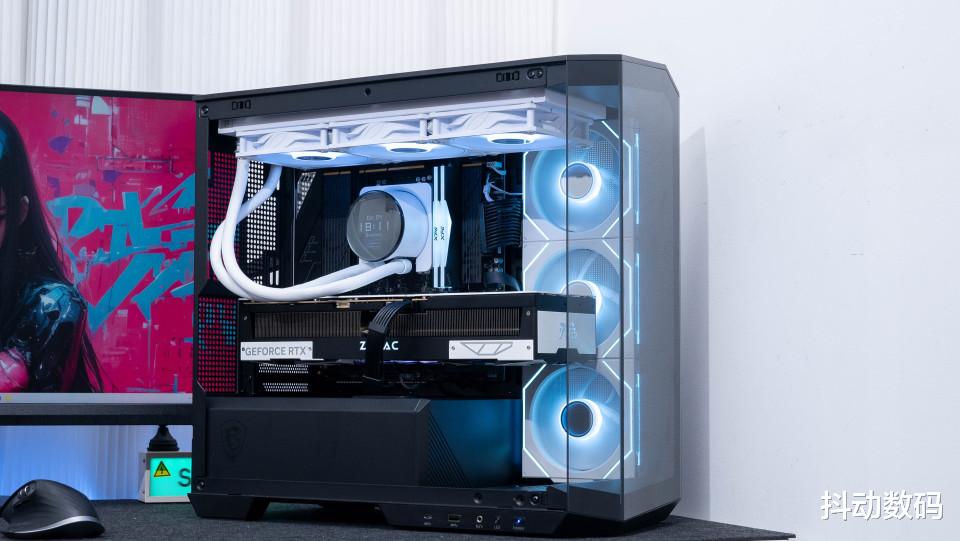 整机展示:配置上尝试了黑白组合的配色方案,一方面选择的索泰RTX 5080 天启OC这张显卡整体可以搭配黑白双色的装机组合。另外一方面尝试过太多纯黑或者纯白的方案后,这样黑白配色组合也会是桌面上另外一道风景。