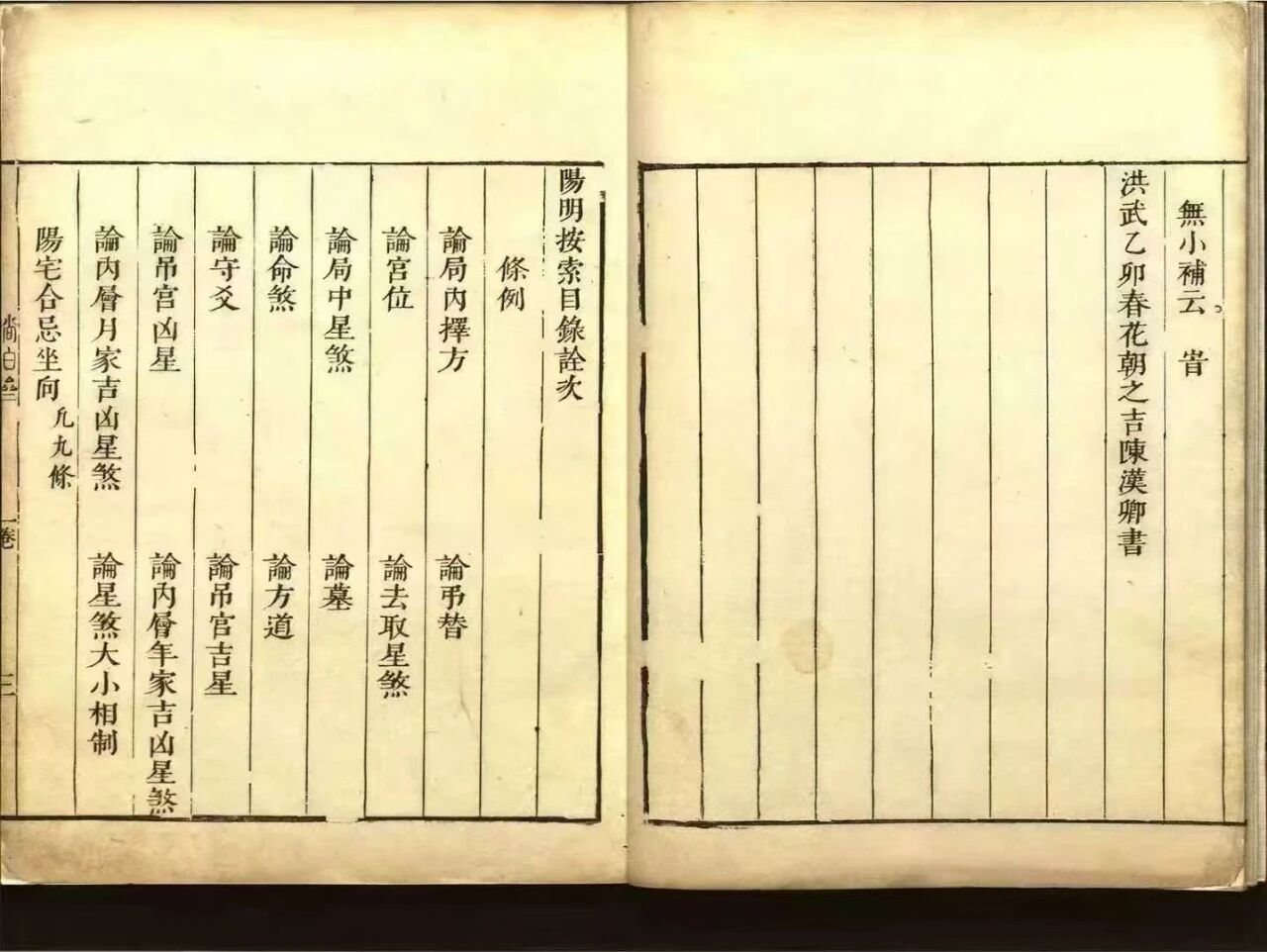 明崇祯五年吴氏尚白斋刻本《阳明按索》,以上下两册 200 页五卷篇幅,封存着明代择吉术的实战精髓。作为《阴阳五要奇书》中的重要典籍,此书由陈汉青撰著,以朱墨两色套印的图局式为核心特色 ——“红字标吉,黑字注凶” 的鲜明标注,让星煞吉凶一目了然,在明代套印技术鼎盛时期的刻本中极具代表性。