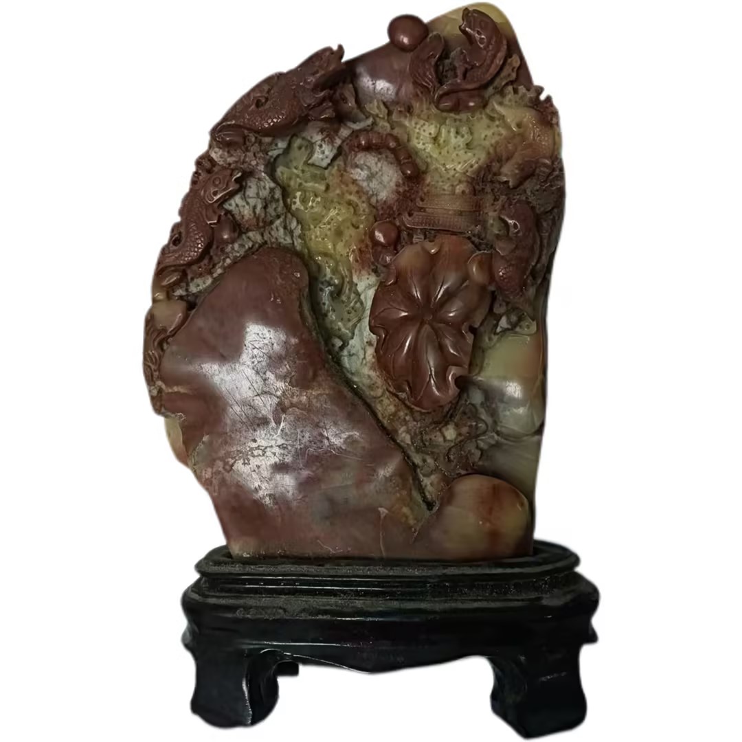 存世稀缺:鸡血大红袍寿山石雕存世不足百件,“龙鱼戏莲” 题材摆件仅约 20 件,多藏于公立博物馆,民间流通真品不足 5 件,是 “圣杯级” 孤品;