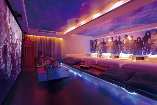 房间里有133寸、1080p整墙的大屏体验和3D环绕音箱,可以制造不输一般电影院的视听效果。