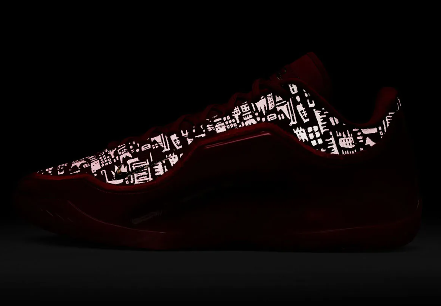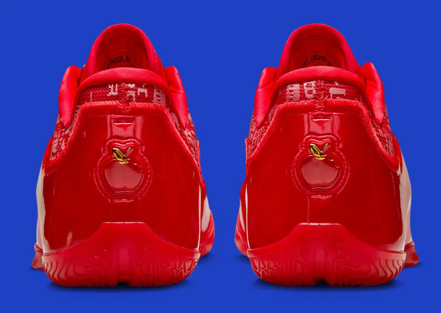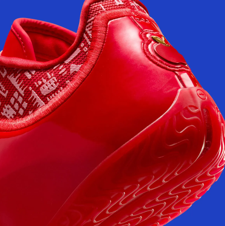 除了红色元素作为主色调之外,鞋履还有一些非常有趣的小细节,比如鞋履后部的金苹果元素,也是在暗示着这位球星成为NBA选秀No.1的故事;鞋面的夜光刺绣元素也有皇冠等各种标志,暗示着这位球星的成长历程;最为有趣的还是双鞋带——鞋履除了红色鞋带之外,还可以更换为蓝色鞋带。