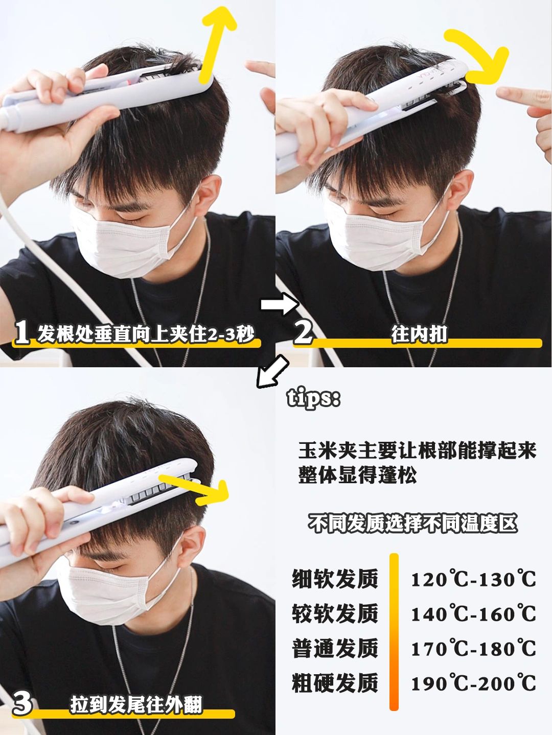 男生想要从外在提升自己,不仅需要好看的穿搭,一个好看的发型也是加分项! 自从上次分享了发型教程后,不少朋友问可不可以不用烫发也可以做出纹理层次感,今天给大家分享用玉米夹做一次性摩根前刺教程!在家也能自己做摩根烫,快get起来吧! 适合人群:1扁塌发质2发量少3平时不好打理4不想烫发5经常需要应酬或约会聚会6想尝试烫发但是担心不好看。 关于步骤:1洗发后、用梳子从上往_下梳順头发 2用吹风机吹干至80%左右,用手轻轻拍打 3玉米夹加热,夹住发根2-3s后内扣向下再外翻 4用发蜡轻拍在头发上,避免直接碰到发根 5拿一小撮发尾旋转轻轻捏出前刺,做出纹理感(重点!) 6用发胶定型,距15-20cm轻按喷头呈霶状喷出。 关于工具:1梳子随便一把梳子都可以,只要能梳得顺!2电吹风建议还是用高速带负离子的,这样吹出的头发不容易毛躁,对发质好,其实不需要选择上千的,两三百就完全够用了!3玉米须夹板这个就可以自己根据心里预算来选择~4发蜡发蜡建议选择哑光,气味不要太重,要自然持久,没有油腻感的5定型喷雾这个也是选味道不要太重的,自然持久!