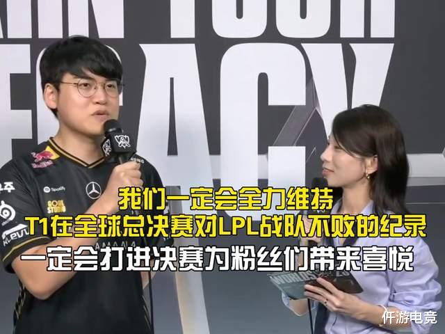 主持人:“T1在全球总决赛的BO5上,面对LPL队伍不会输,目前已经12连胜了。但下一场又要遇到LPL战队,对TES有自信的部分是什么呢?”然后Gumayusi意气扬扬地说:“其实相对于我们,我认为TES才是感受更多压力的那方,各方面我都充满信心。”