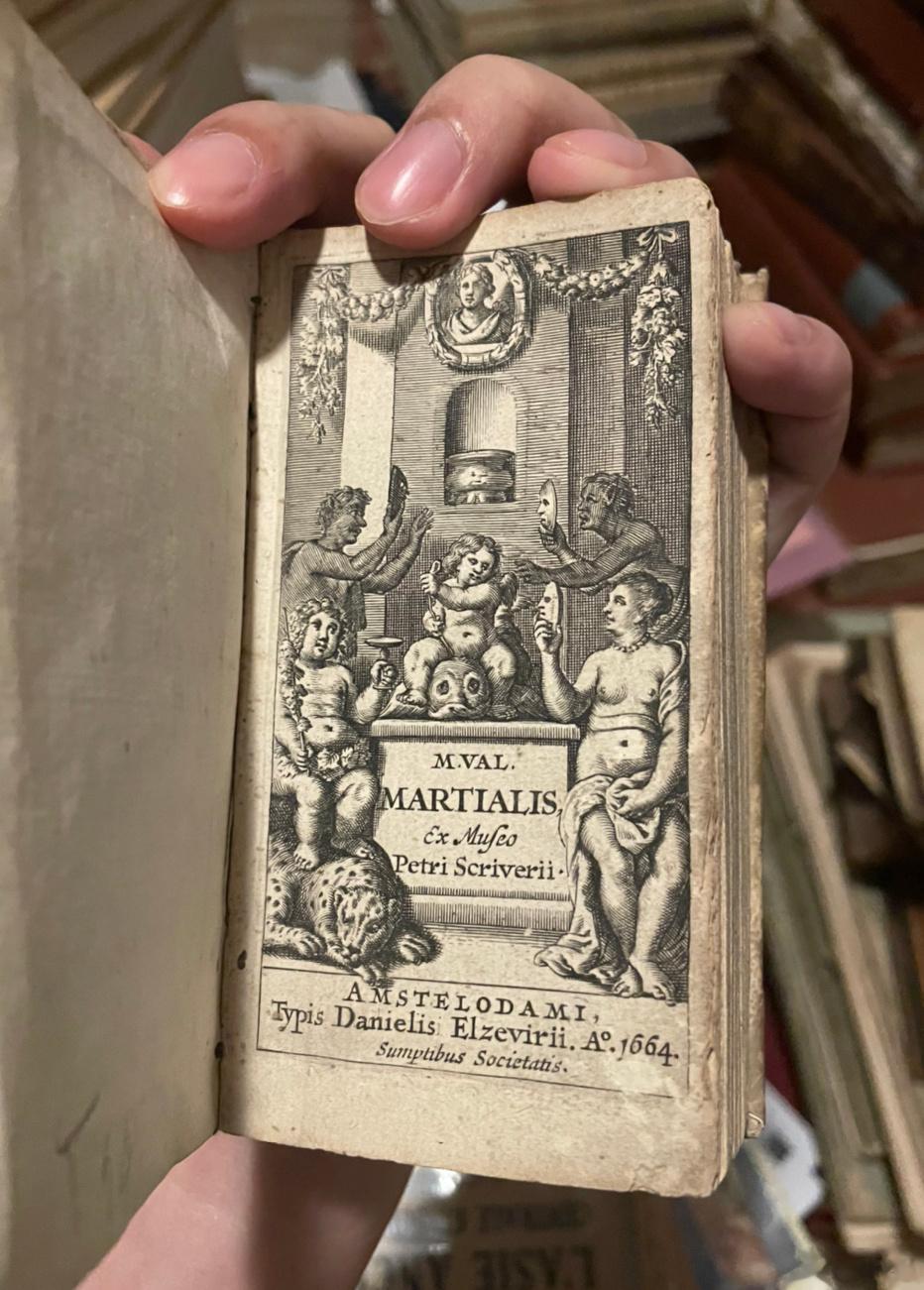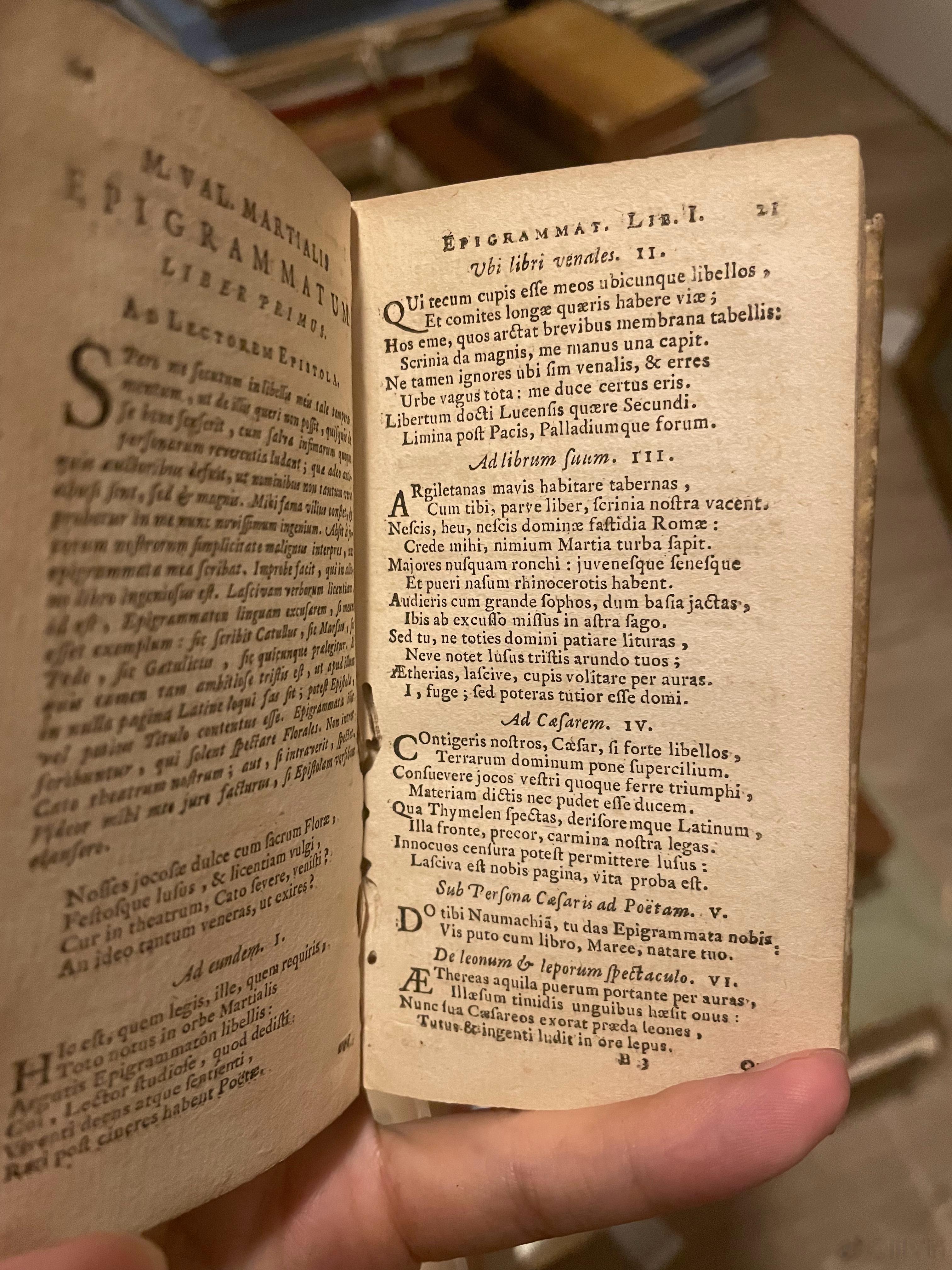 这本Elzevirii社1664年印刷的马提亚尔诗集非常迷你,大约巴掌大小。但是如果细细阅读就会发现该尺寸才是诗人的本意。在Epigrammata 1.2 中他曾提及:“如果您想带着我的作品行走四方,伴您度过漫长的旅途的话,购买这些用皮纸装订而成的小书吧。将您的书柜留给长篇巨作,一只手就可以握住我的书。“不知道书商在印刷和装帧前是否考虑过这段,不过确实非常契合千年前作者的想法。