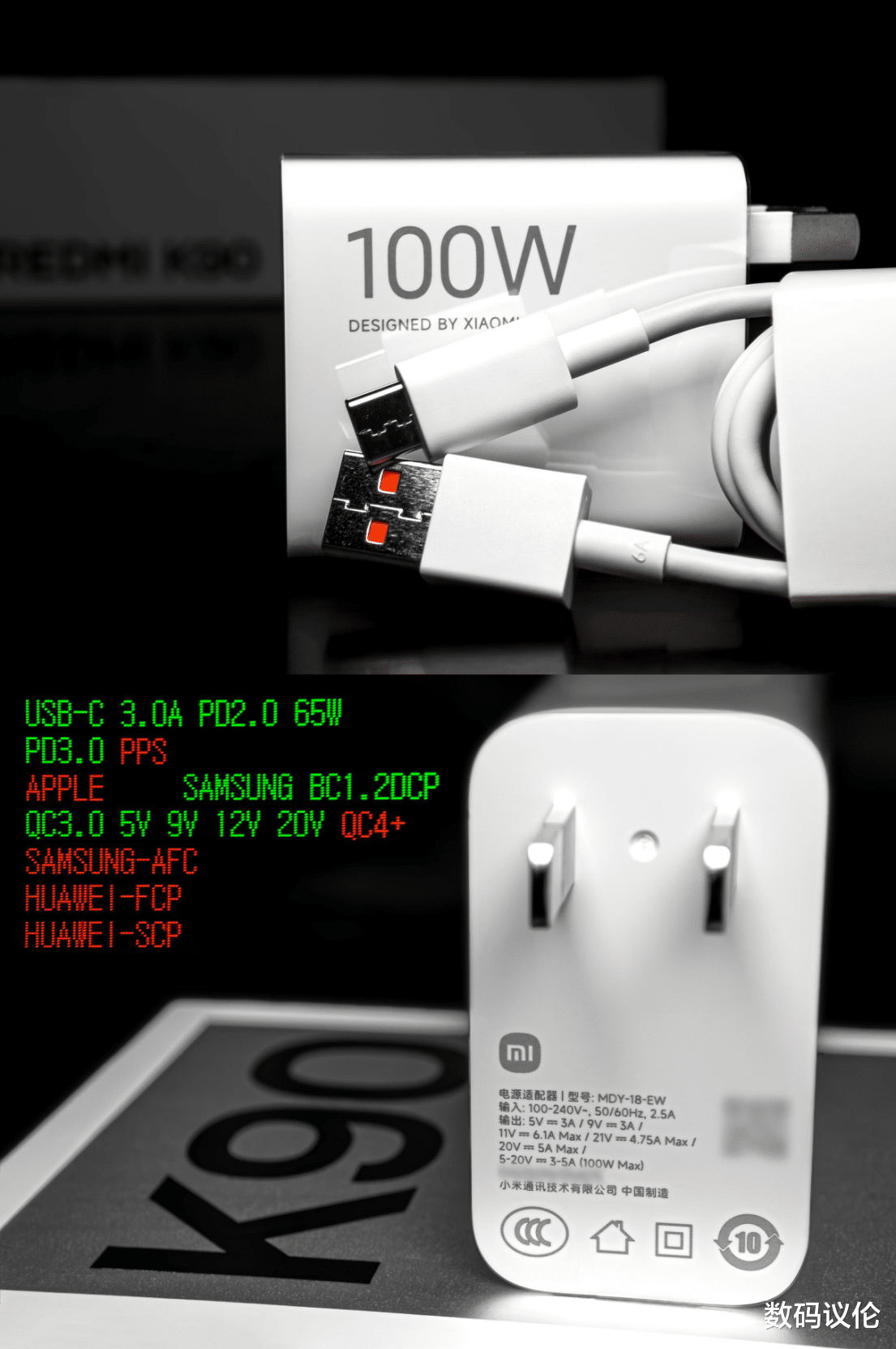 附带的100W充电头型号为MDY-18-EW,符合新国标插脚半包要求。