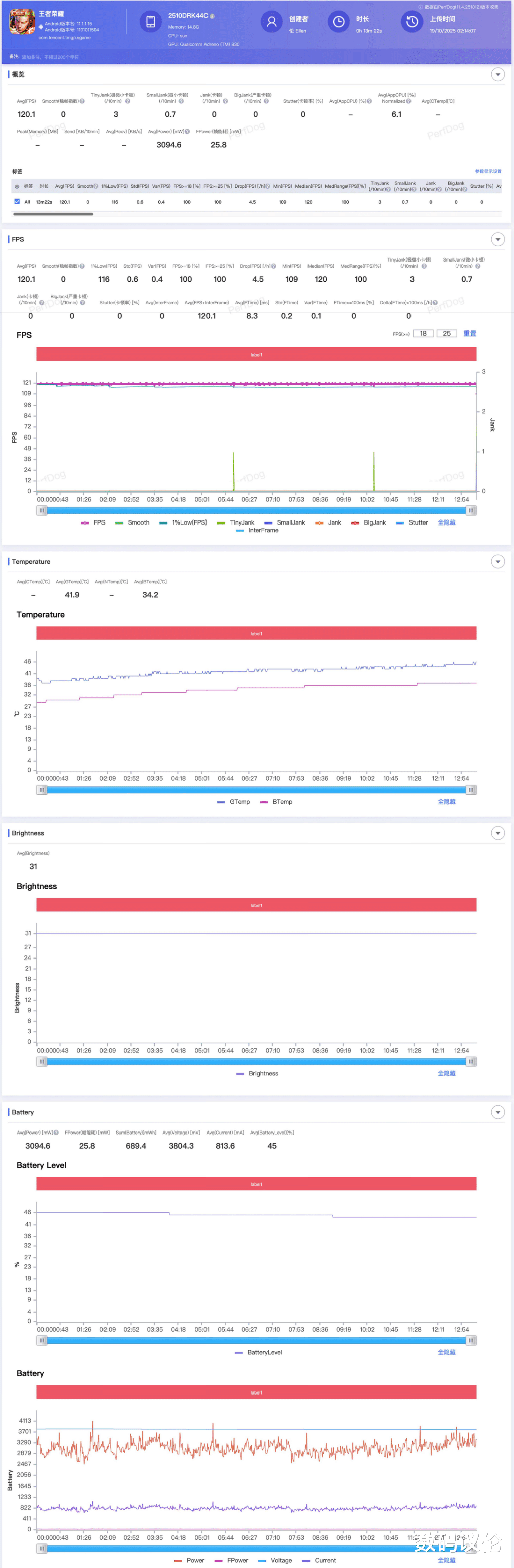 13分钟单局5v5王者荣耀的表现相对“稳”,毕竟今年各家旗舰甚至中端,全高几乎都能平均120跑下来,平均3W功耗放在今天也说不上一骑绝尘。