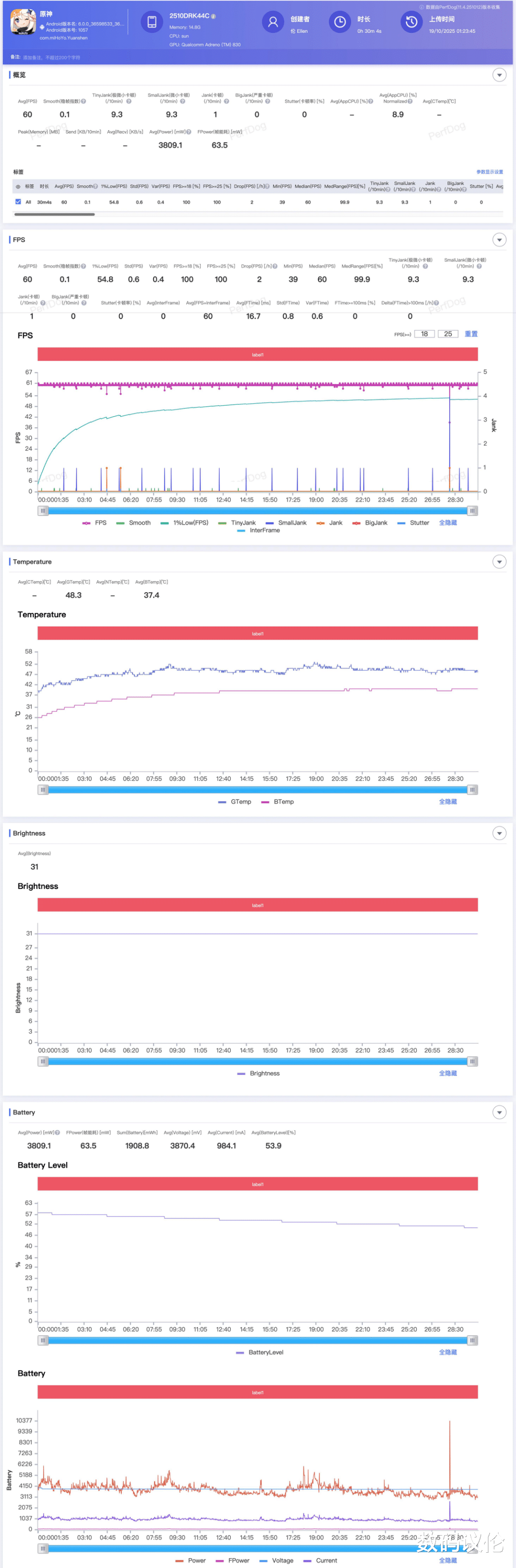 但原神就有点说法了,全高依然稳60这个不用说,在更大的屏幕上却实现了和小米15差不多的平均3.8W整机功耗。