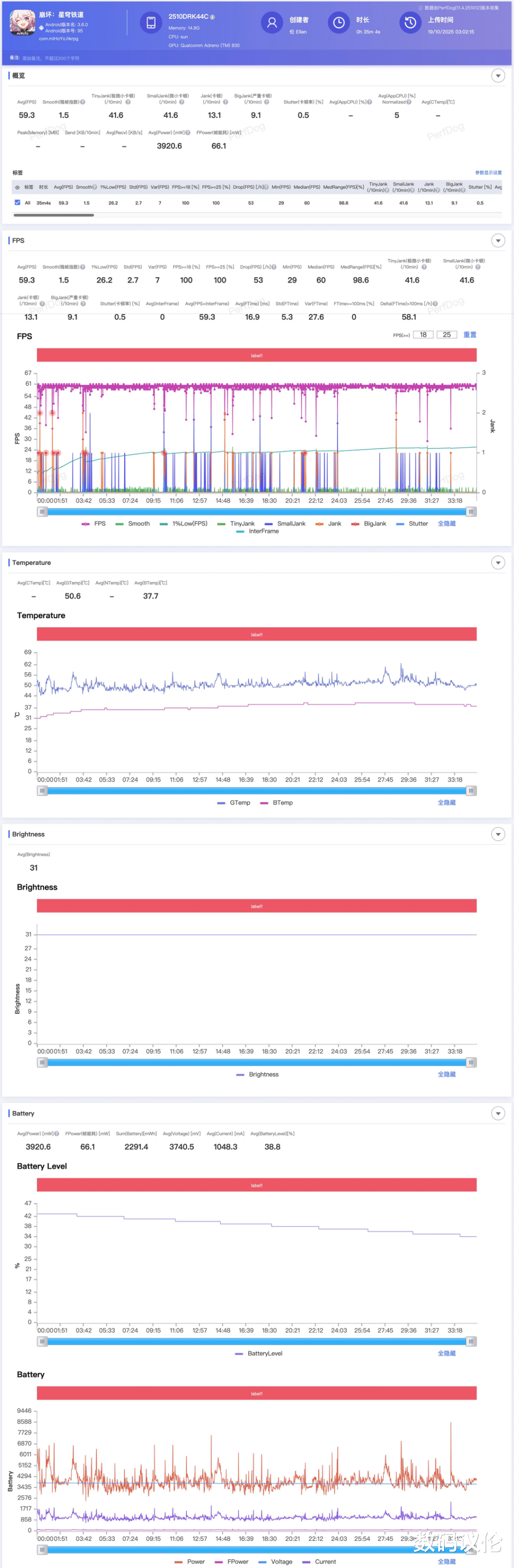 K90倒是没这么逆天,但在卡顿次数明显下降的同时,在3.9W的功耗上把平均帧率干到了59.3,平均温度37.7℃,最高温度仅40℃.