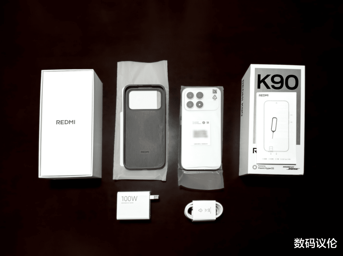 盒中除REDMI K90主机外,还包含了电源适配器、USB Type-C数据线、手机保护壳、说明书、插针。进网许可粘贴在手机背面,正面屏幕出厂已贴好高透软膜。