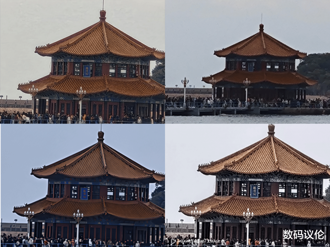 栈桥前拍桥上的回澜阁,变焦到30x并开启超级长焦,REDMI K90(左上)明显在四个对比机型中领先,画面相对自然而清晰。