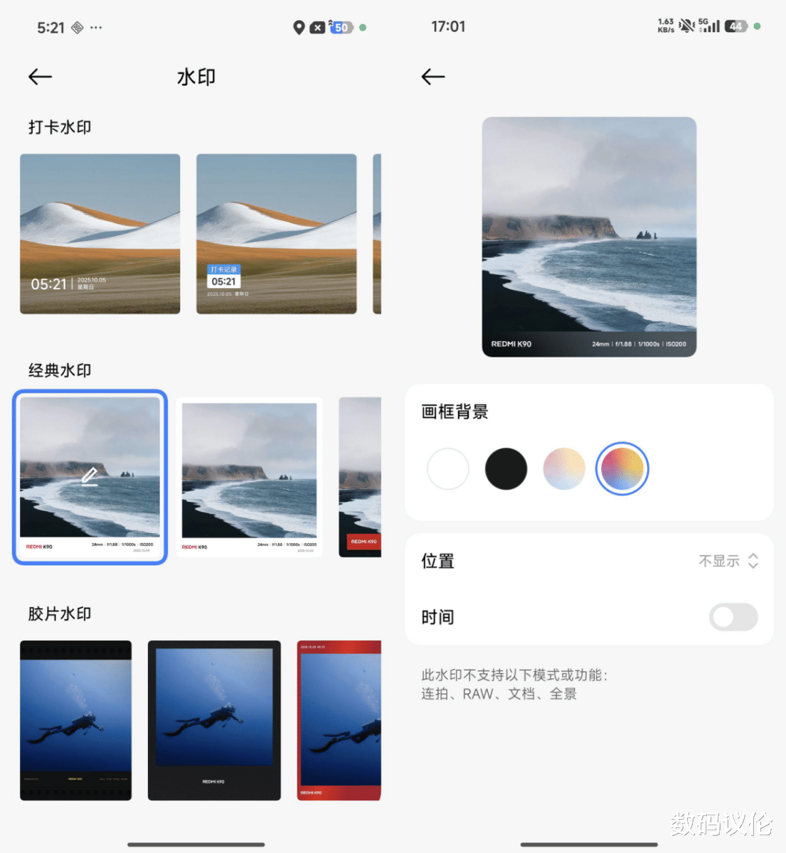 水印更是支持四种类型(标准、打卡、经典、胶片)18种样式,主流的水印自定义功能也都支持了,比如高斯模糊取色、自定义logo与文字等。